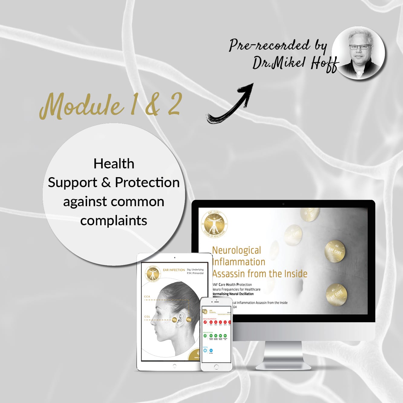 Module One focuses on enhancing neural oscillation and optimizing biochemical functions to support overall health. Participants will gain practical skills in using ANF Care Discs and protocols, learning to manage and improve resilience against common health complaints. This module provides foundational training, offering comprehensive insights into the application of neuro frequencies and their role in promoting well-being.